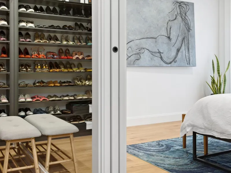 Spacious master bedroom with built-in wardrobes and windows on two sides, allowing for plenty of natural light