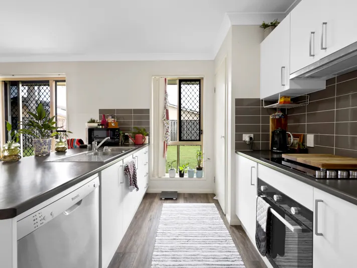 - Modern kitchen with stainless steel appliances including dishwasher, ceramic cooktop, under-bench oven and rangehood