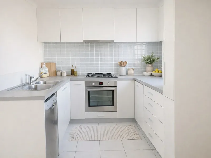 - Sleek, modern kitchen with stone benchtops and quality stainless steel appliances.