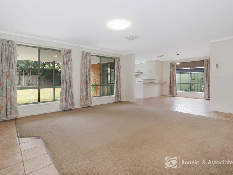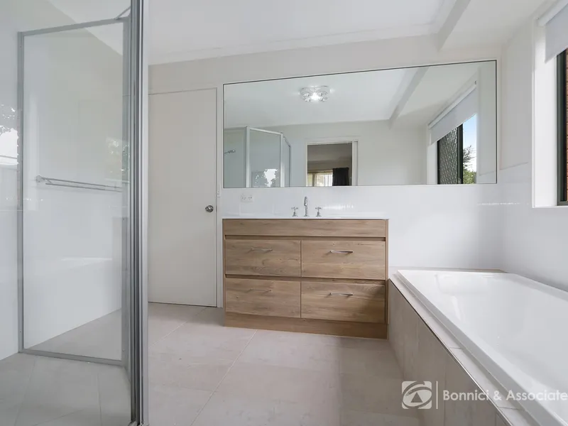 The open-plan kitchen, equipped with gas cooking and a dishwasher, looks out to the undercover alfresco, creating the perfect setting for indoor and outdoor entertaining. The spacious living and dining areas flow seamlessly, while a separate living room offers additional space for relaxation or family time.
