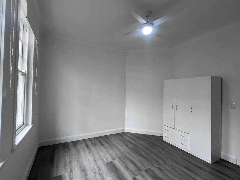 • First bedroom includes built-in cupboards and a ceiling fan.