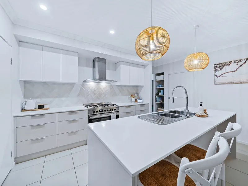 • The kitchen is one for the culinary experts of the family, with plenty of storage, a walk-in pantry with fridge space, soft close cabinetry, five burner gas cook-top & oven plus ample bench space lit up with beautiful pendant lighting