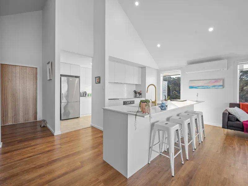 Built in 2024, this contemporary home delivers modern comfort and effortless coastal living in a quiet, leafy pocket just moments from the beach and the Greens Beach Golf Course. Designed with a thoughtful layout and quality finishes, the light-filled open-plan kitchen, dining, and living zone flows seamlessly to a generous undercover deck, perfect for entertaining or simply soaking up the peaceful outlook and sweeping views.