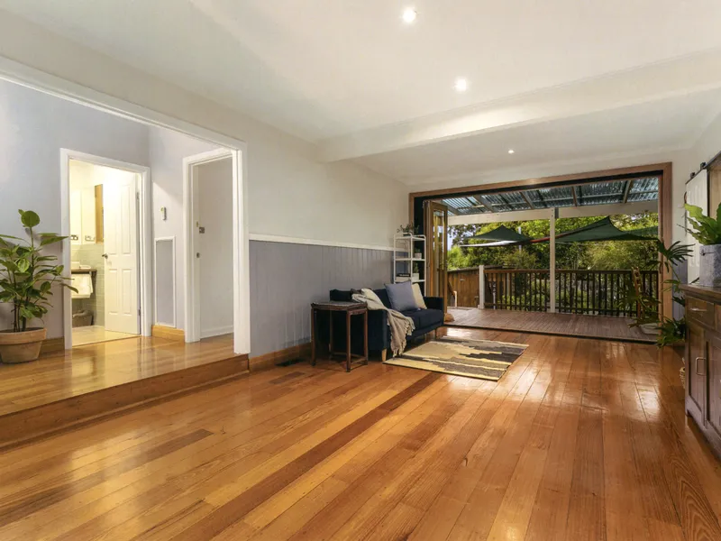 - Carpeted living room with split system (heating and cooling) and exposed beams