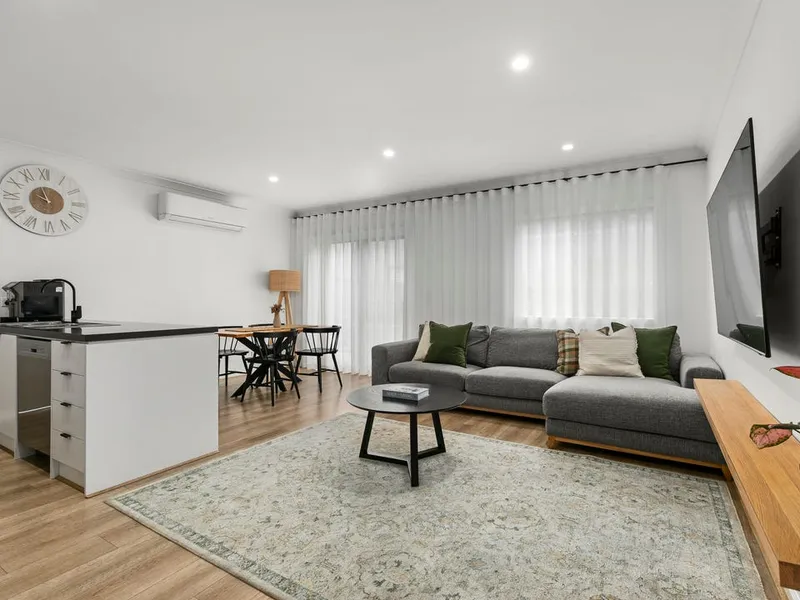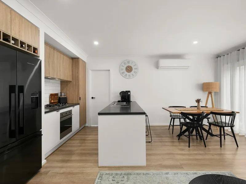At the heart of the home is a light-filled open-plan living and dining area, seamlessly connected to a modern kitchen complete with stone benchtops, stainless steel appliances and ample cupboard space. The thoughtful layout allows for comfortable everyday living and effortless entertaining.