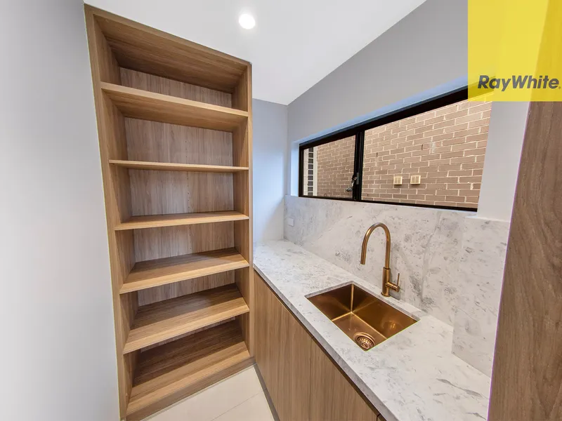 - Gourmet Kitchen & Walk-in Pantry: A true chef's delight! Features a massive marble-finish island bench, sleek wood-grain cabinetry, a built-in oven and gas cooktop, plus an expansive walk-in butler's pantry complete with an elegant copper-tone sink and tapware.