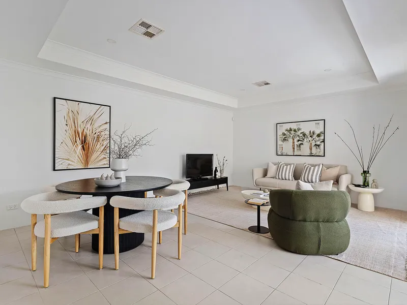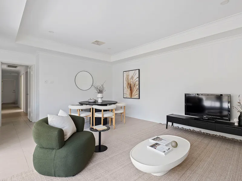 The well-equipped kitchen offers ample storage and includes a dishwasher for added convenience. Stay comfortable year-round with efficient air conditioning. The European-style laundry adds a touch of sophistication to daily chores.