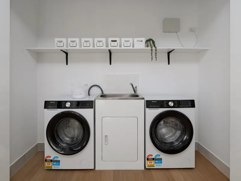 Shared free laundry is included with 2 washing machines and a full size shared kitchen for all your culinary needs.