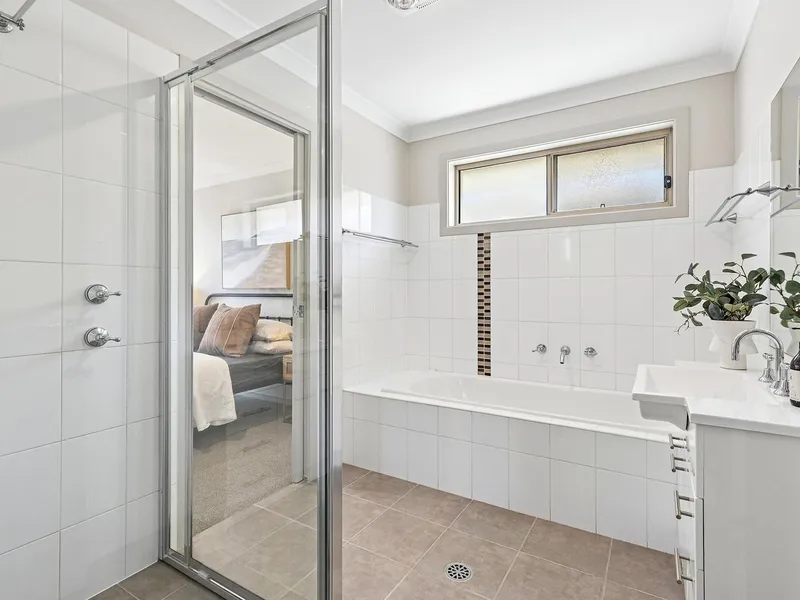Upstairs, two of the bedrooms include built-in robes, while the master suite offers a walk-in robe, ensuite, and private balcony. The stylish main bathroom features a bathtub.