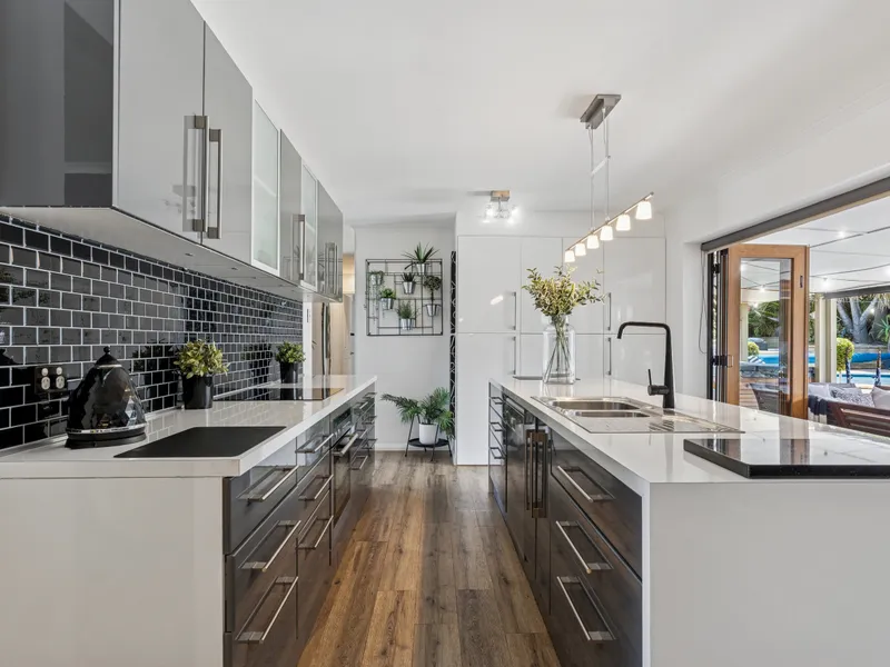 - Well-equipped kitchen with island bench and generous storage in floor-to-ceiling cupboards