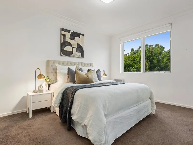 Two robed bedrooms are thoughtfully zoned for privacy, with one opening to its own balcony to capture the bay breeze and the other featuring triple mirrored robes. A pristine bathroom with bathtub is complemented by a European laundry, extensive storage, intercom entry, split-system heating and cooling, and electric panel heating for year-round comfort.