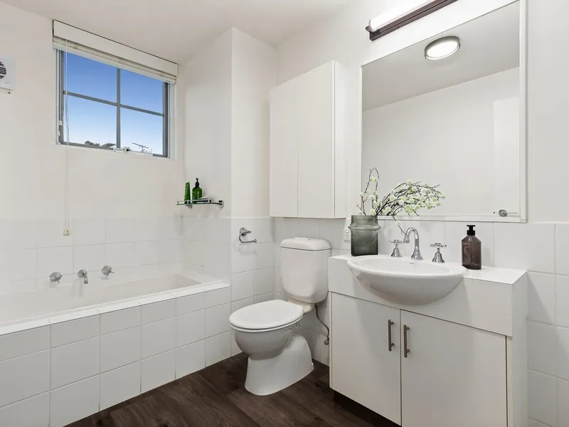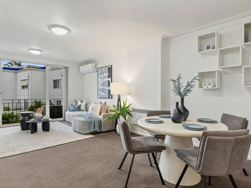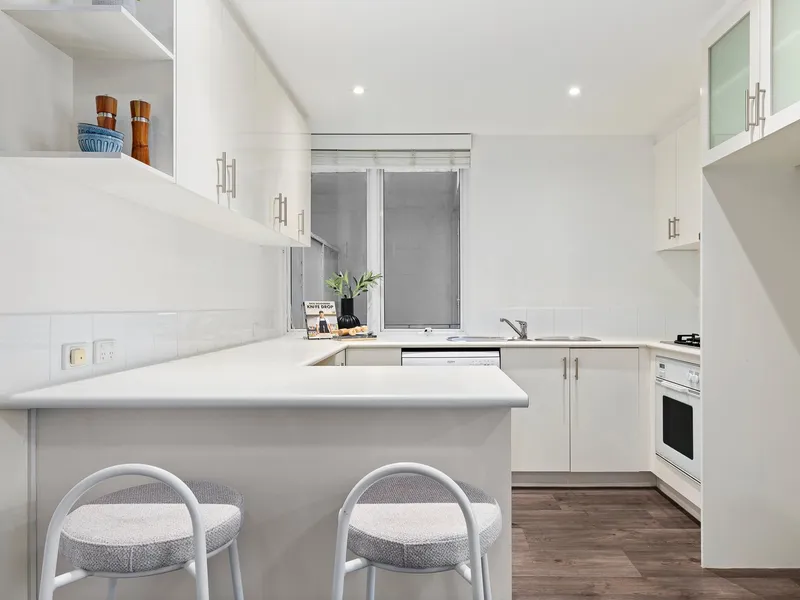 Peacefully set on the first floor and accessed via Small Street, the impeccably presented home showcases the generous proportions and solid appeal of a classic-style apartment. Light-filled living and dining flows to a private balcony, while a Mediterranean-inspired landscaped piazza below creates a picturesque backdrop for relaxed al fresco enjoyment. The well-appointed kitchen is equipped with a gas cooktop, dishwasher and convenient breakfast bar.