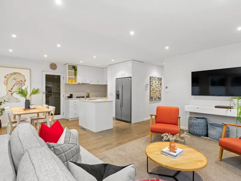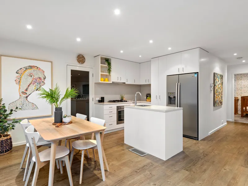 Light-filled and lofty with a glossy stone and stainless-steel appliance kitchen centre-stage (fridge available for use) and a designer-style fully-tiled bathroom zoned quietly with the bedrooms. Extras including high-powered gas ducted-heating, multiple reverse-cycle air-conditioners and a versatile fully-lined and low-voltage lit auto-garage perfect to double as home-office or playspace. Please note no carpet throughout has been replaced with engineered timber floors.
