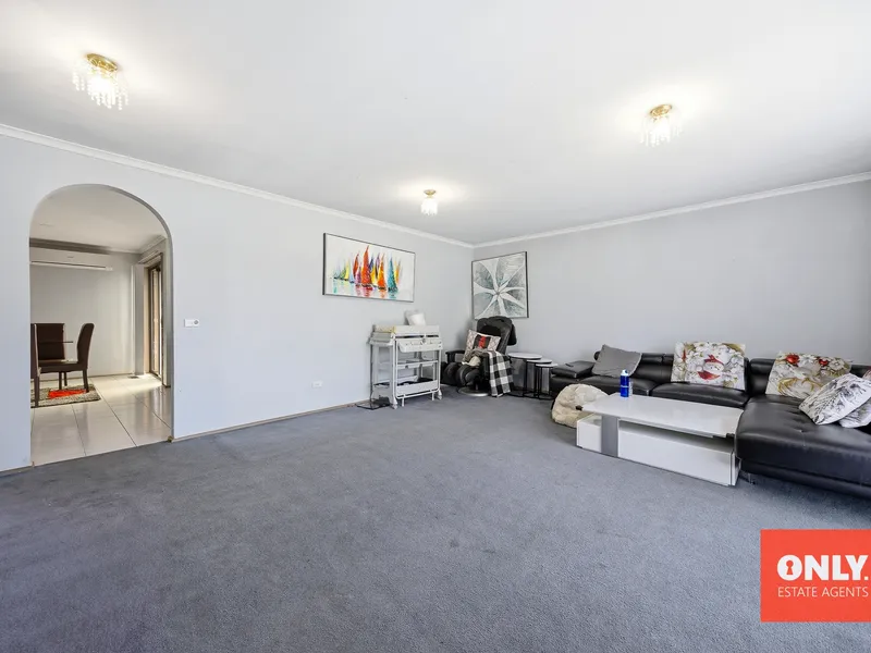 Upon entry, you are welcomed by a secure entrance foyer leading through to a spacious lounge and dining area, perfect for family living and entertaining. The well-appointed kitchen features ample bench space and storage, stainless steel appliances, and overlooks the meals/family room, creating a practical and inviting central hub of the home.