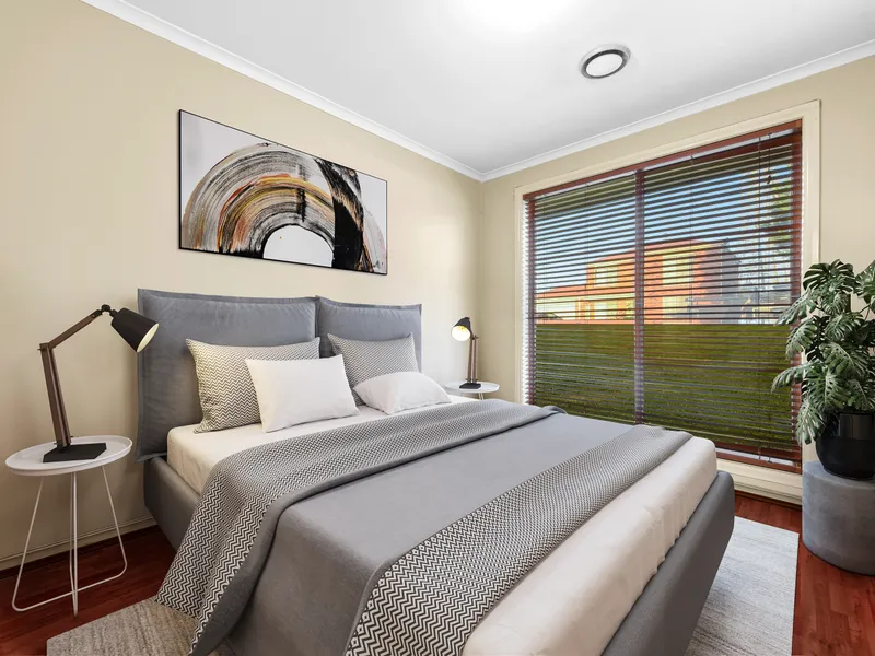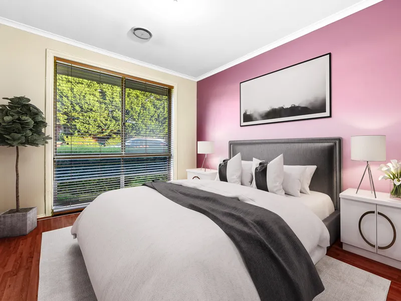 Located in a tranquil pocket just a 10-minute stroll from Narre Warren South P-12 College, this lovely abode sits in a quiet neighborhood surrounded with green spaces. A short walk takes you to nearby bus stops as well as conveniently located local shops. The exterior boasts a traditional brick-veneer facade, a single lock-up garage and ample off-street parking in front. An undercover portico and hedges enhance the appeal of this hidden gem.