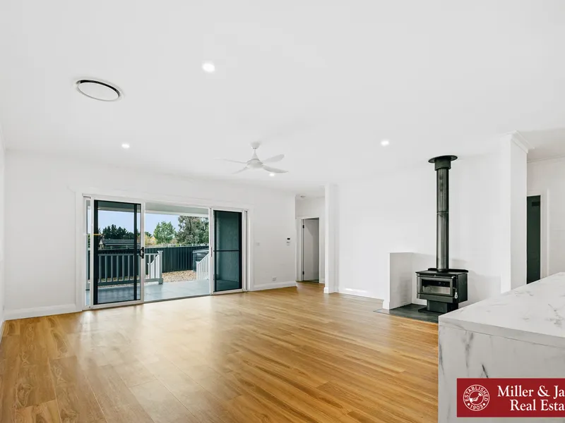 • Open plan living/dining off kitchen, with slow combustion wood fire.