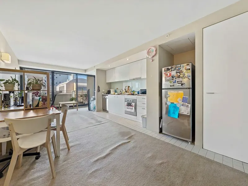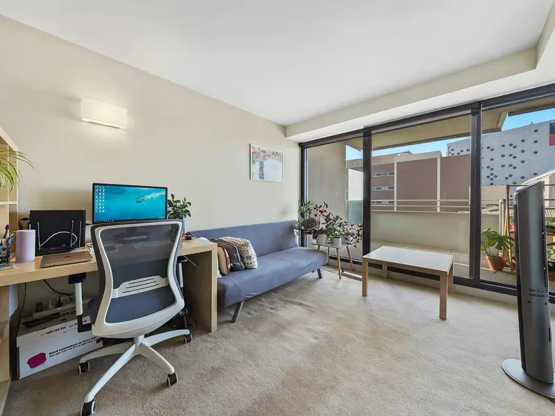 This beautifully presented one-bedroom apartment offers a light-filled open-plan design. The generous bedroom features a spacious built-in robe, additional storage, and a wall heater for added comfort. The modern kitchen is well appointed with a marble benchtop, ample cupboard space, and stainless-steel appliances including a gas cooktop, electric oven, and dishwasher.