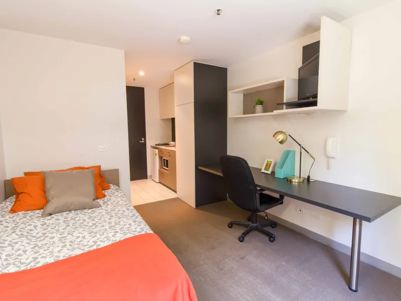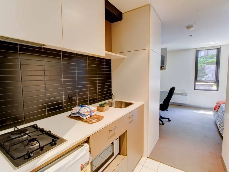 Each furnished apartment comes with intercom security entrance, a single bed, full kitchen with gas cooking, electric heating, microwave and fridge, cutlery and crockery, stylish bathroom, study desk and chair, and colour television.