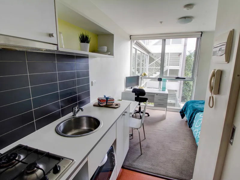Each furnished apartment comes with intercom security entrance, a single bed, full kitchen with gas cooking, electric heating, microwave and fridge, cutlery and crockery, stylish bathroom, study desk and chair, and colour television.