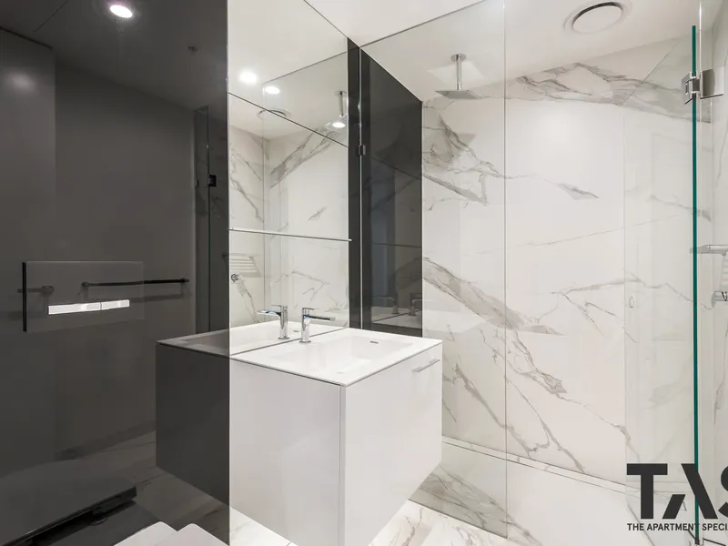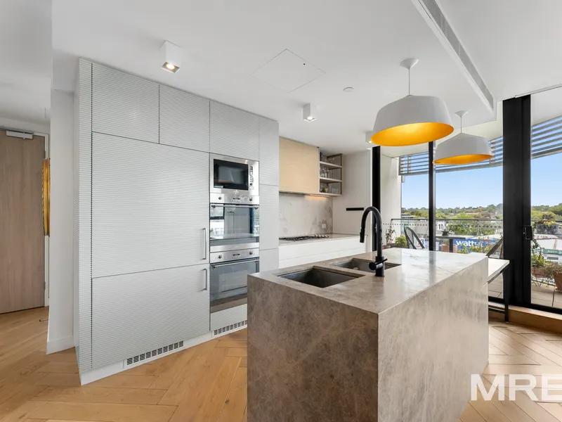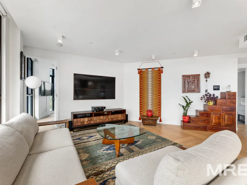 Intelligently designed to maximise space and light, this contemporary apartment offers sophisticated interiors and a considered floor plan with relaxed living and dining spaces accompanied by a sleek marble kitchen boasting Miele appliances and Fisher and Paykel DishDrawer.