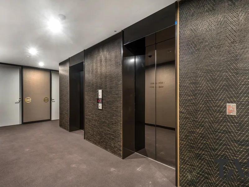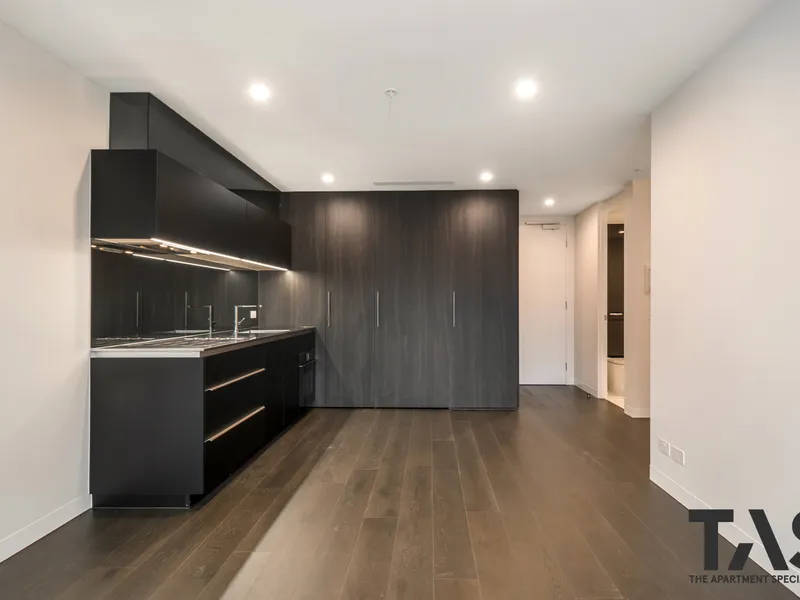The bedroom features a study nook and built-in robes, while a fully tiled bathroom serves in style. Broad balcony, secure basement parking, MITSUBISHI split system air-conditioning, video intercom, a gymnasium and a communal terrace add further appeal to this stylishly appointed apartment.
