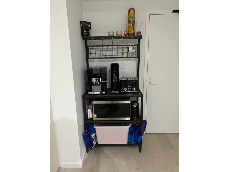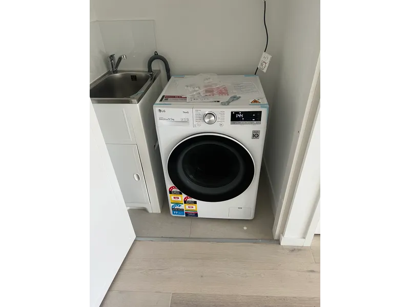 The laundry cupboard includes a sink, washer/dryer, shelving stand, and even a rechargeable stick vacuum cleaner with all attachments for effortless cleaning.