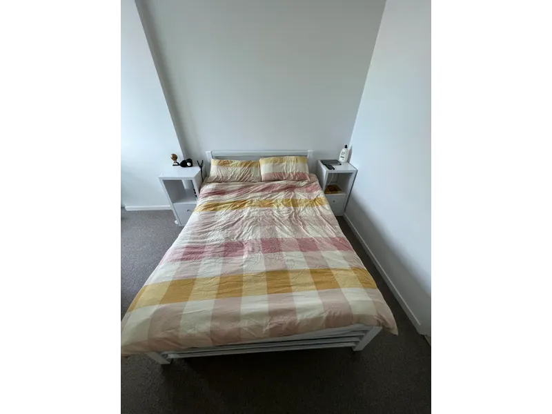 Both bedrooms come with built-in robes, offering plenty of storage space. The master bedroom features an ensuite and comfortably fits a queen bed, while the second bedroom is equipped with a double bed and bedside tables, conveniently located opposite the second bathroom.
