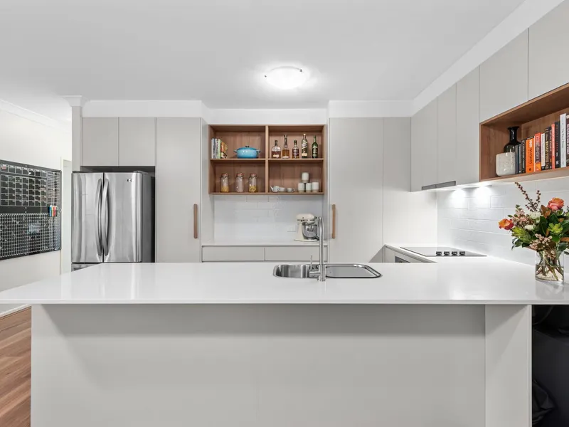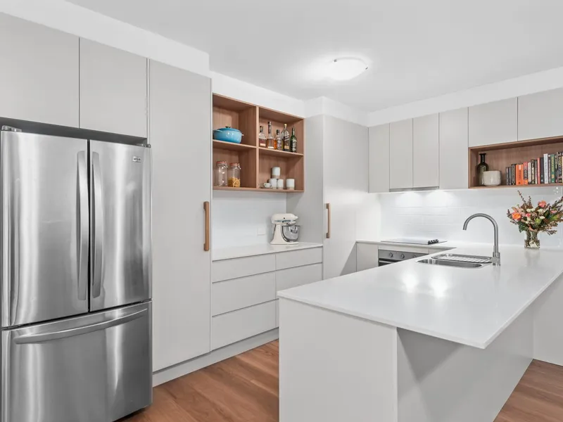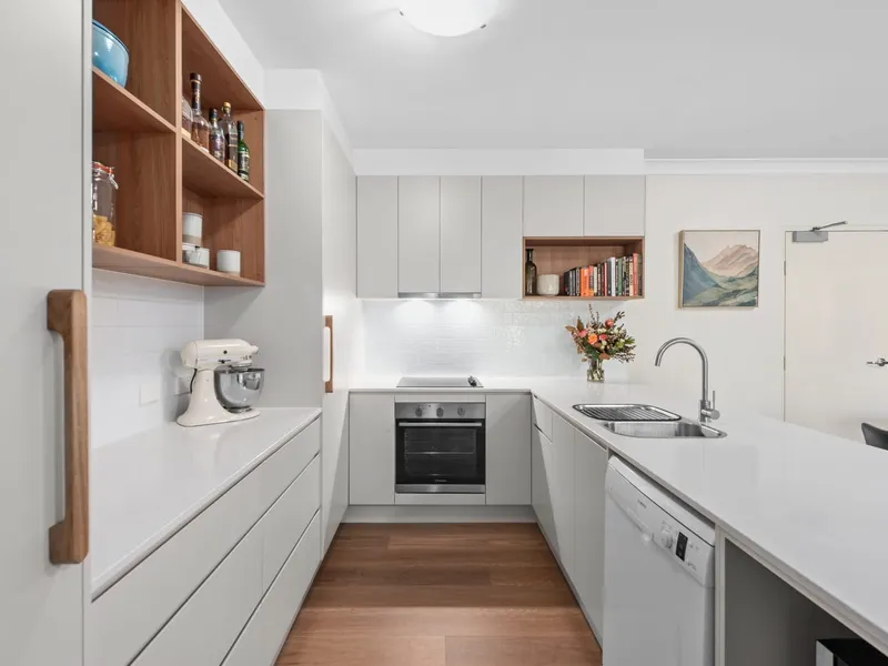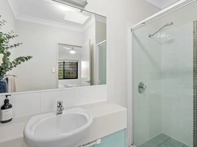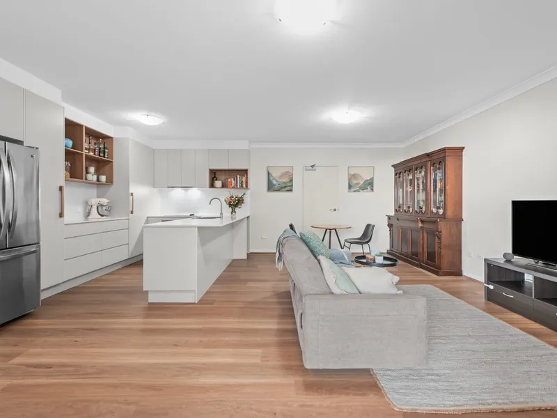 Set on an elevated, east-facing aspect, the apartment captures natural light and cooling breezes throughout. The open-plan living and dining area is air-conditioned and flows seamlessly through glass sliders to a private balcony, while also connecting to a shared alfresco space within the complex, creating a relaxed indoor-outdoor feel.