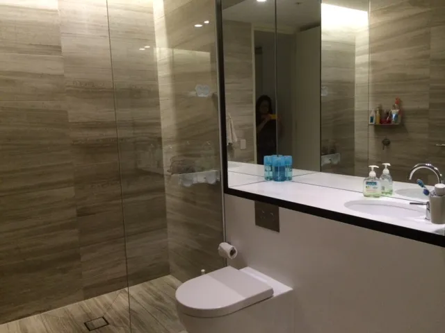 Fully tiled modern bathroom.