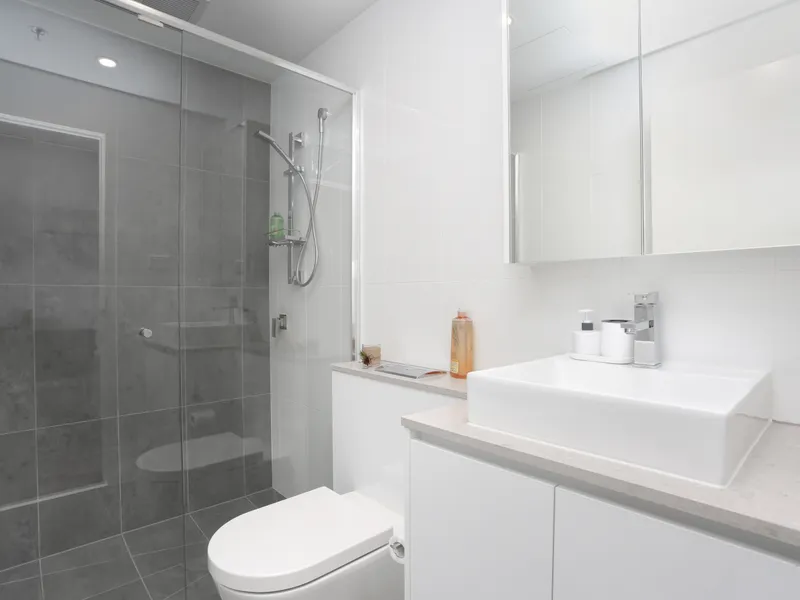 The stylish bathroom is fitted with high-quality fixtures, including a separate shower and vanity. There is also plenty of storage space, making it both functional and comfortable.