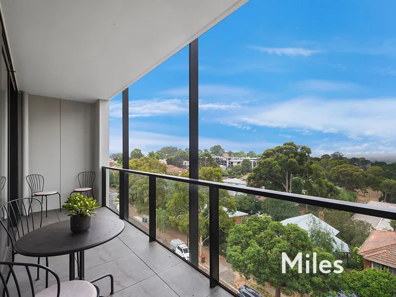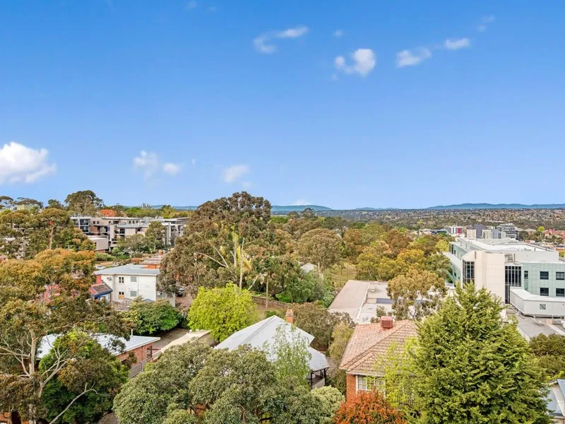 Be greeted by a spectacular view towards the Dandenong Ranges the instant you set foot inside the chic open-plan living domain, enhanced with full-length windows that maximise the viewing pleasure; for a closer look, simply step out onto the large balcony to soak up the sweeping vista.