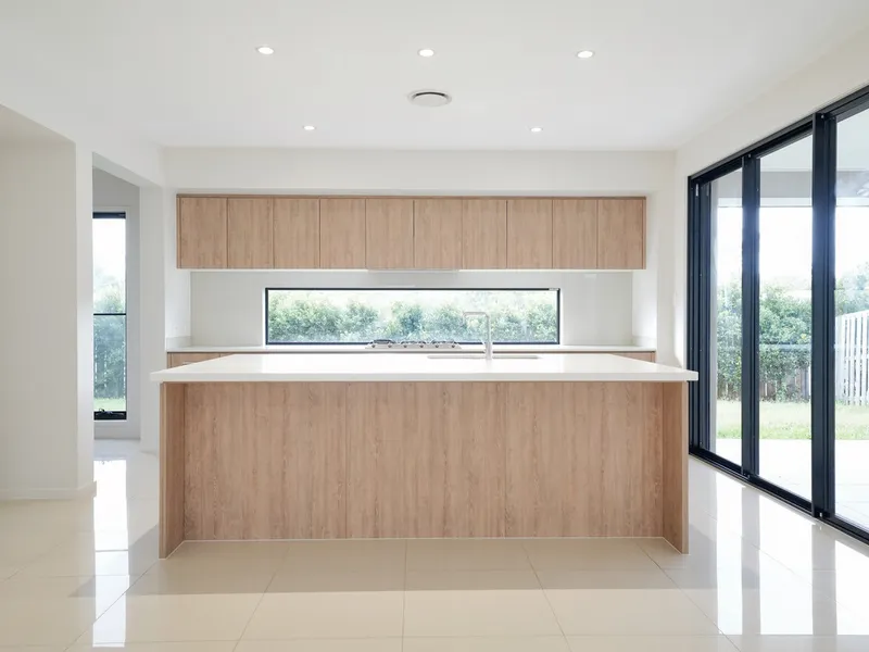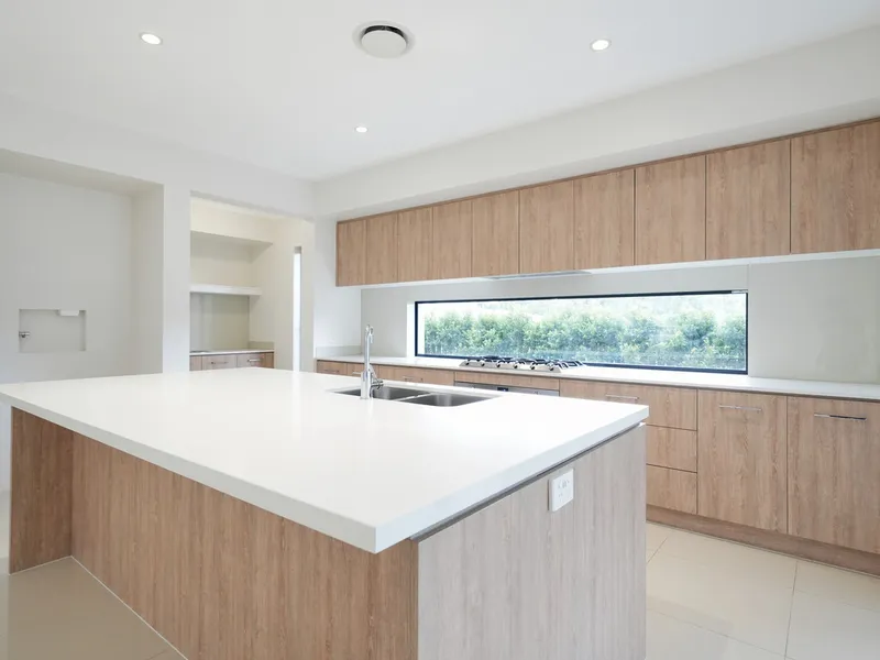 - Roomy, well finished kitchen with wide gourmet oven and gas-burner cooktop, plenty of cupboard space, large island breakfast bar/serving area, walk in pantry, double fridge space and stunning splashback,