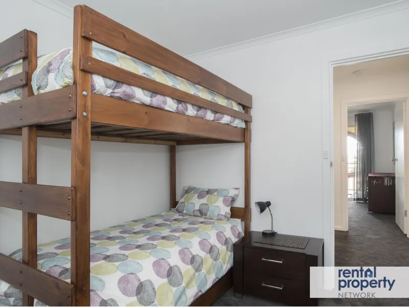 - 2nd Bedroom with timber bunk beds and mattresses, side table and lamp