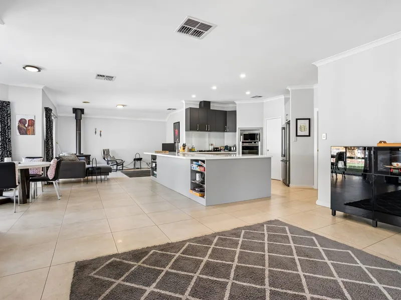 Designed for both relaxation and functionality, the home features a spacious open plan kitchen, living and dining area, complemented by a separate, dedicated theatre room—perfect for family movie nights or entertaining guests. A wood fire in the main living area provides warmth and atmosphere during the cooler months, while ducted reverse cycle air conditioning ensures year-round comfort. The master bedroom and study are also fitted with split system air conditioning for added convenience.