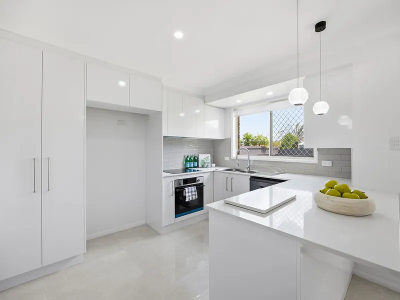 - Well-appointed kitchen with ample bench space and storage, overhead cabinets, gas cooktop and oven, dishwasher