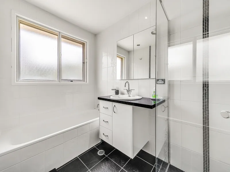 Upon entry, a large living room greets you with large windows capturing the light and framing the leafy outlook. Double glass sliders open to connect you to the sunny, separate kitchen and dining area. You will love the functionality of the U-shape kitchen layout with generous benchtop space and overhead cupboards for storage. Well equipped with a dishwasher & gas cooktop, there is even space for a double fridge.