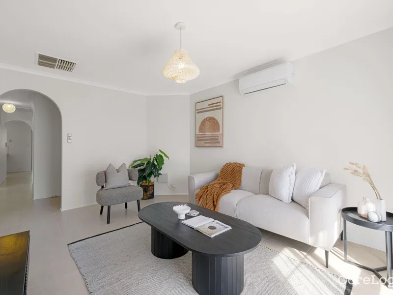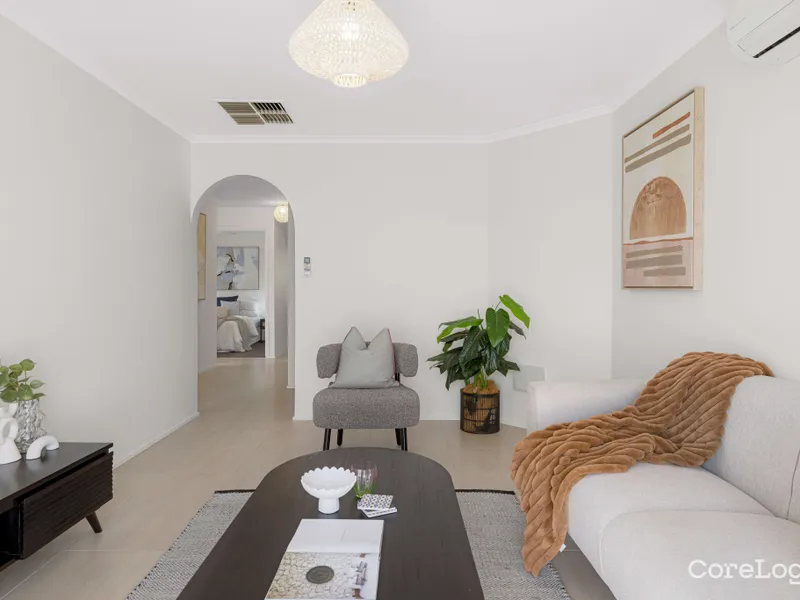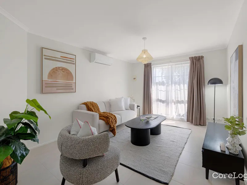 Step inside to discover a light-filled living room featuring French windows and split system air conditioning, flowing seamlessly over sleek tiled flooring into the kitchen and meals area.