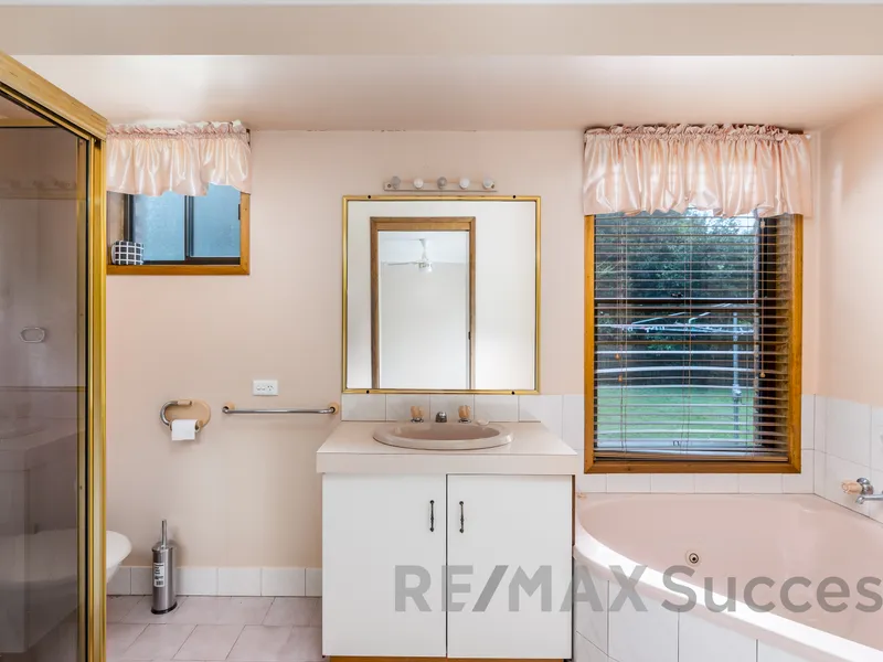 - Generous master bedroom complete with ceiling fan and ensuite featuring spa bath, separate shower, vanity and toilet