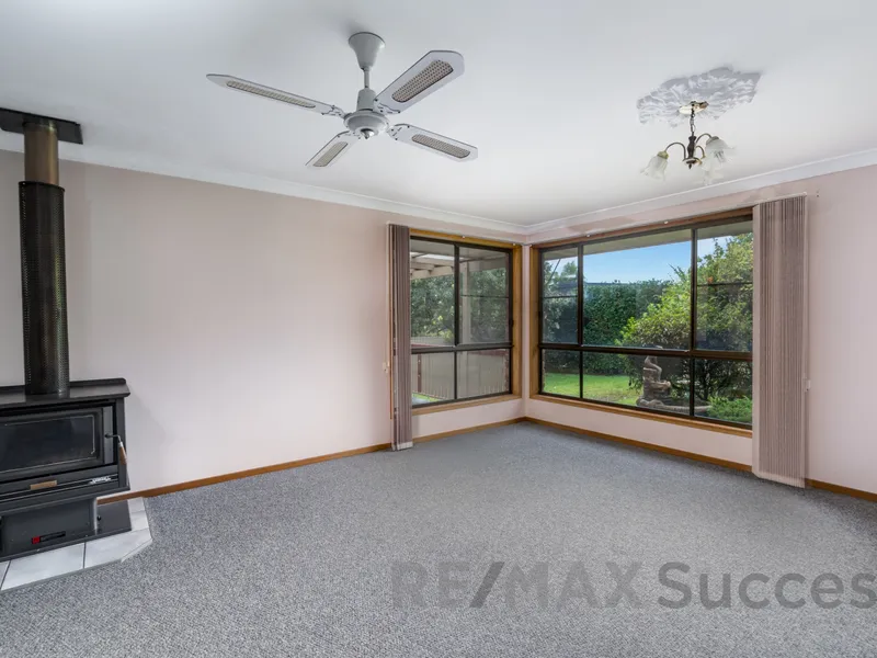 The home offers excellent living space with a large separate carpeted lounge room featuring a ceiling fan and wood heater, creating a cosy setting during the cooler months. A spacious tiled open-plan family and dining area adjoins the kitchen and provides a central hub for everyday living.