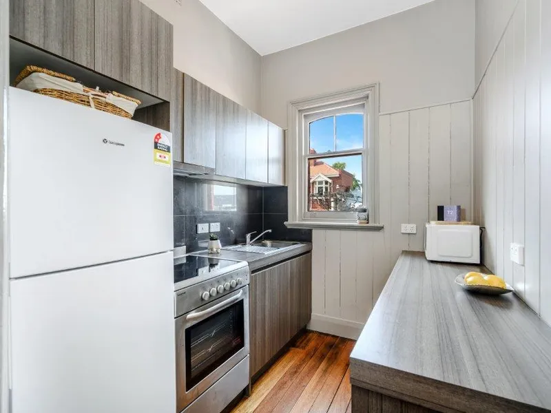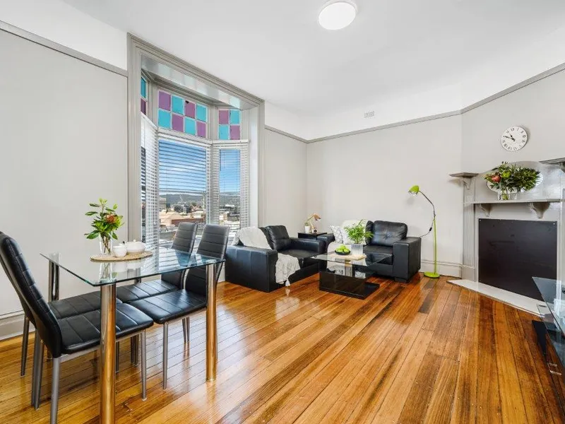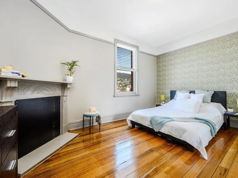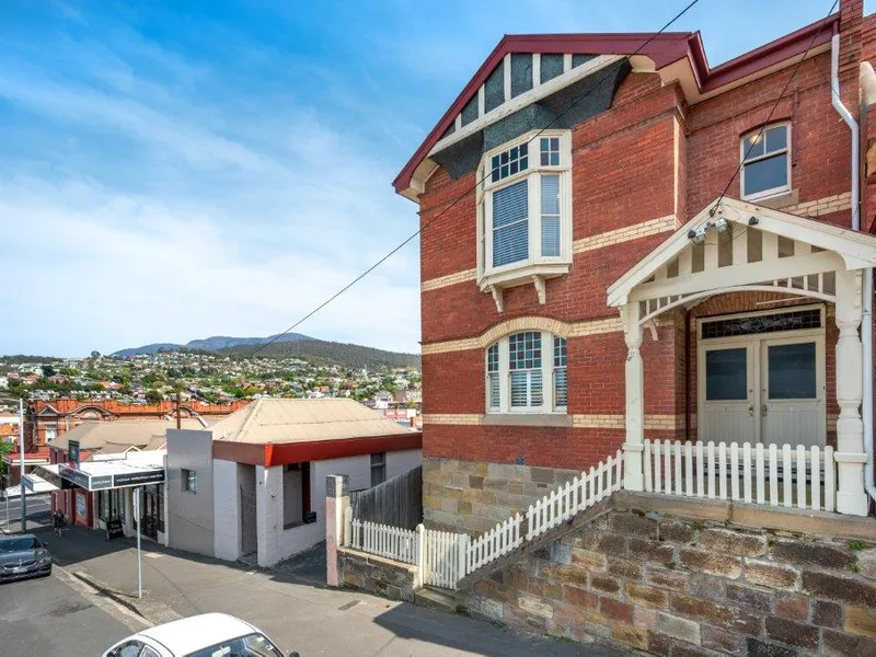 On the top floor and refreshed throughout, the apartment blends original features with modern updates, including, high ceilings, beautiful timber floorboards, bay windows and open decorative fireplaces. Accessed by a private staircase and offering two bedrooms, a separate dining/lounge, galley style kitchen and modern bathroom with walk-in shower. Bright, airy and sunny throughout with great views of the Hobart city skyline. On street permit parking only.