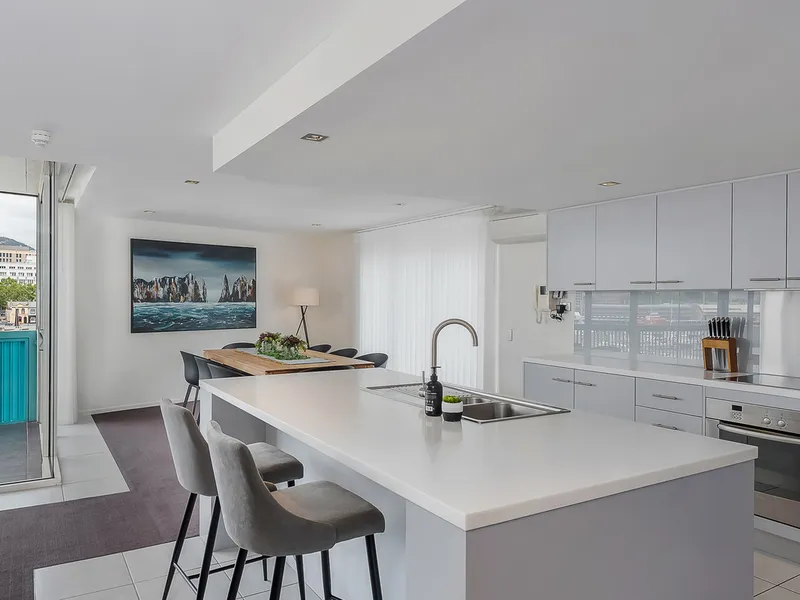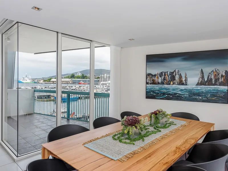 Positioned within the prestigious Zero Davey, this spacious three-bedroom residence offers an exceptional standard of waterfront living in the heart of Hobart. Overlooking the iconic Franklin Wharf, the apartment captures sweeping water views.