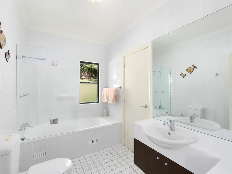 The modern kitchen has a large island bench, stainless steel appliances and a large walk-in pantry. The main bathroom includes a shower over the bath and a separate toilet.