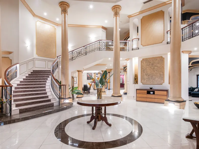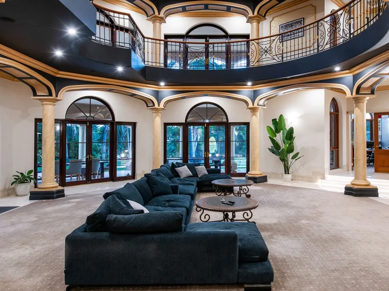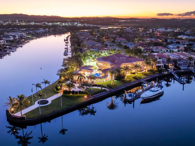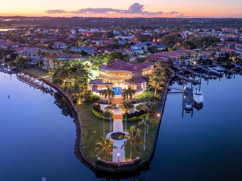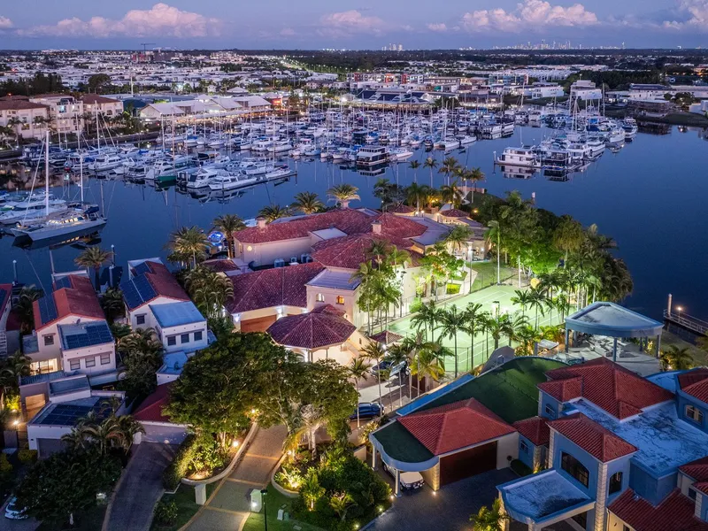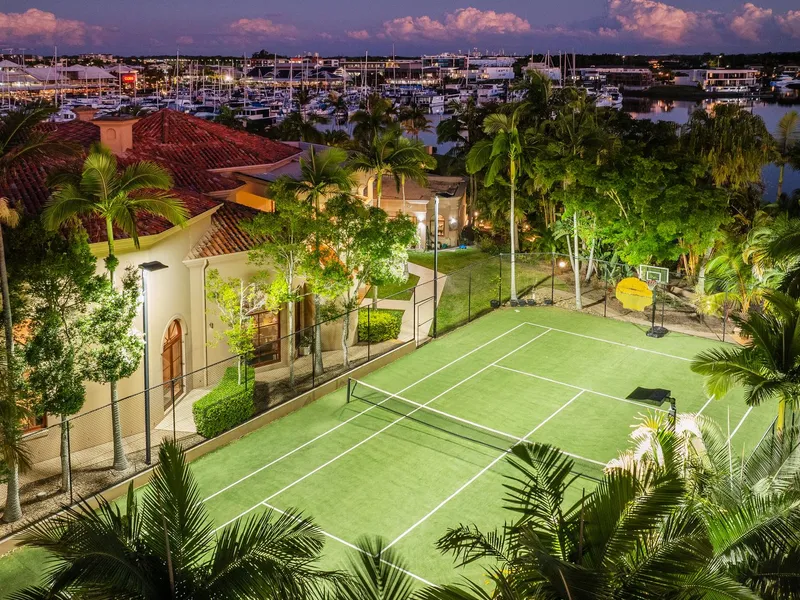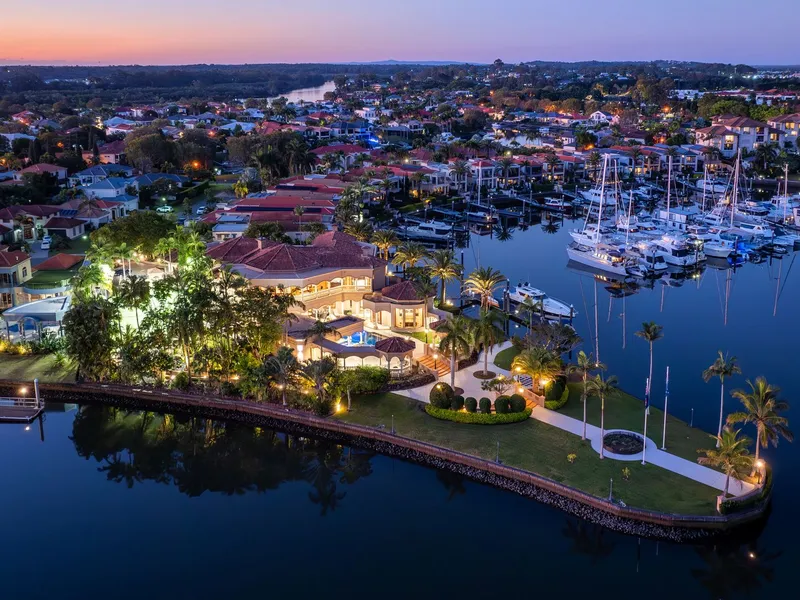 - Mediterranean-inspired masterpiece of 1,815 m2* - Occupies a private waterfront peninsula of 4982 m2* - Long list of lifestyle features including resort style pool, spa & full-size tennis court - Buggy ride to Hope Island Marina, moments to championship golf courses - Subject to body corporate approval for a marina berth on the Grand Canal up to 60 meters Seeking its inspiration from the Mediterranean, this waterfront residence occupies the largest block within the exclusive Rosebank Gardens Estate of Hope Island Resort. Exuding a commanding presence, striking columns, dome ceilings, marble tiles and an ornate staircase immediately capture your attention upon arrival before leading you through to the formal dining and lounge. Capable of hosting intimate soirees or large scale functions, nearly every room of this exquisite residence serves up a sublime marina view. Gather your guests by the pool for cocktails, host garden parties by the canal or soak in the breezes from the upper balconies - your entertaining options are endless. To cater for a crowd, the commercial kitchen comes with a full complement of inclusions such as Miele cooktops, multiple dishwashers, double oven and a walk-in cold room. Concoct your drink of choice in the wet bar which also features a dishwasher and servery to the pool area. The presidential master suite is also positioned on this level and boasts a huge walk-in wardrobe and dressing room. Showcasing stone and gold plated finishes, the decadent ensuite also features his and hers toilets and bidets, twin showers and a sumptuous spa bath for the ultimate in indulgence. Ascending the staircase to the mezzanine level, the remaining 3 bedrooms are revealed, all of which include walk-in robes and an ensuite. Each bedroom opens onto the balconies offering panoramic water views. Outside, the sparkling in ground pool and spa are akin to a 5-star resort and are serviced by a pool house complete with an outdoor kitchen, shower, toilets and a change room. A short stroll through the manicured gardens will take you to your private entertainment areas over looking the Hope Island Marina and commercial precinct beyond. And for those who love a game of tennis, you can practice your forehand on your very own full-size tennis court. Your every whim and need is taken care of living in this remarkable home which offers a long list of luxury features including: - Hollywood-style home cinema with projector and bar - Home office and adjoining library/sitting room - Ducted air-conditioning throughout for optimal climate control - Cbus and speaker system - 3 car garage and loads of storage options An inspection is a must to appreciate the sheer scale and grandeur exuded by this magnificent sanctuary. Occupying a substantial parcel of land provides future owners with the option to extend, rebuild or remodel to suit your needs and personal taste. Hope Island Resort is a gated community boasting world-class facilities, beautiful parklands and 24-hour security. From this prime position, you are only a quick buggy ride to the Hope Island Marina, home to boutique stores, fine dining restaurants and the local supermarket. Championship golf courses, theme parks and popular beaches lie at your doorstep. Easily accessible to the M1, Surfers Paradise can be reached in approximately 20-minutes whilst the Brisbane CBD is less than an hour away. Properties of this calibre seldom come to market. Don't miss out on securing this landmark home which offers an extraordinary lifestyle afforded to a privileged few. Call now to arrange your private inspection today. *Approximate