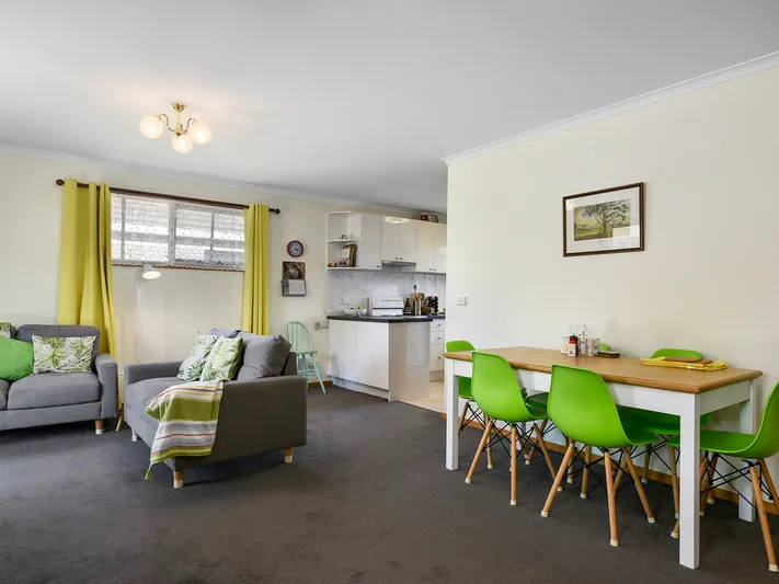 The living room opens onto a deck with stunning views of Mount Wellington and the River Derwent, ideal for relaxing or entertaining. The modern kitchen has plenty of storage, quality appliances, and a breakfast bar, with access to a covered pergola for outdoor dining.