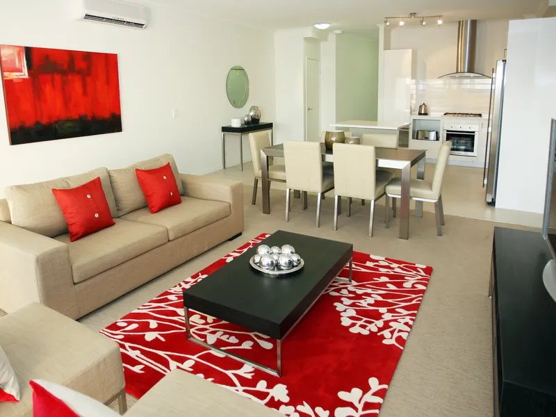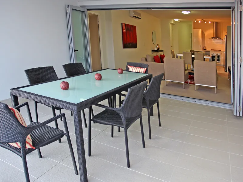 • Large open-plan living and dining area with ceiling fan, air conditioning and balcony access