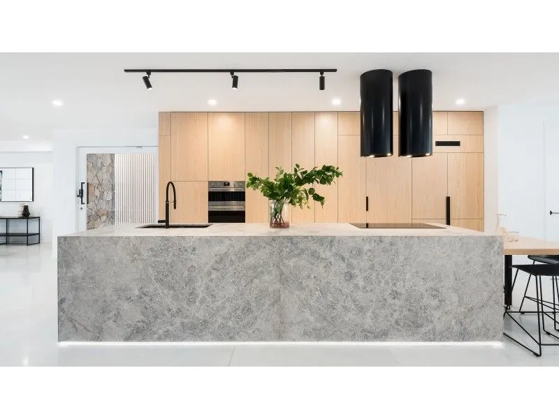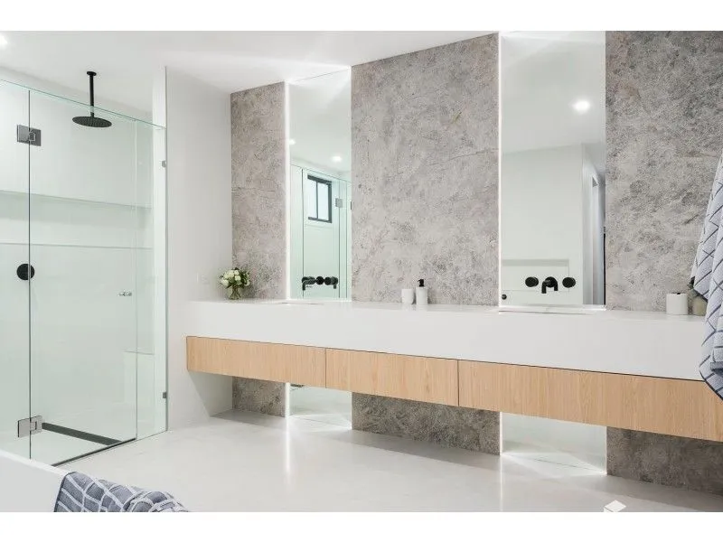 - Extensive use of natural stone throughout, including floor-to-ceiling feature walls and large format quartz tiles throughout