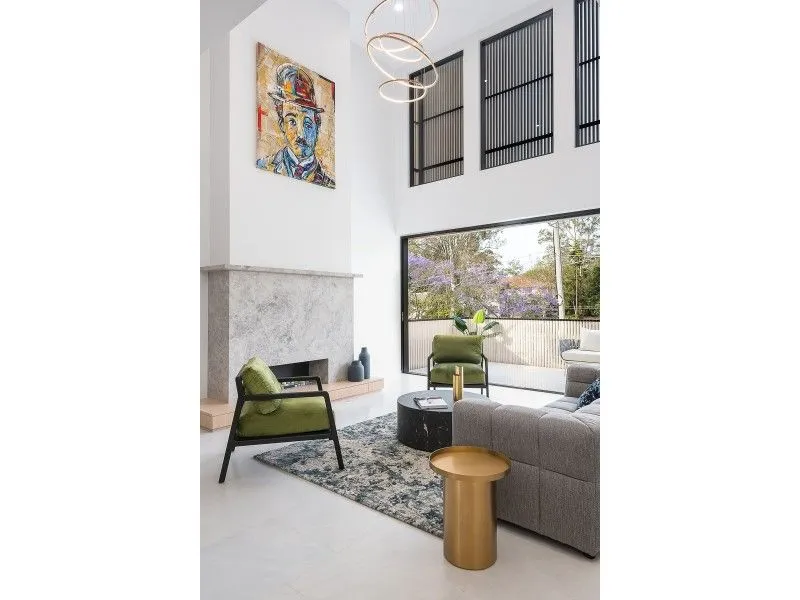 - Expansive open-plan living areas of grand proportions featuring a breathtaking 5.7-meter high feature wall, fireplace and soaring high ceilings that take in private green outlooks