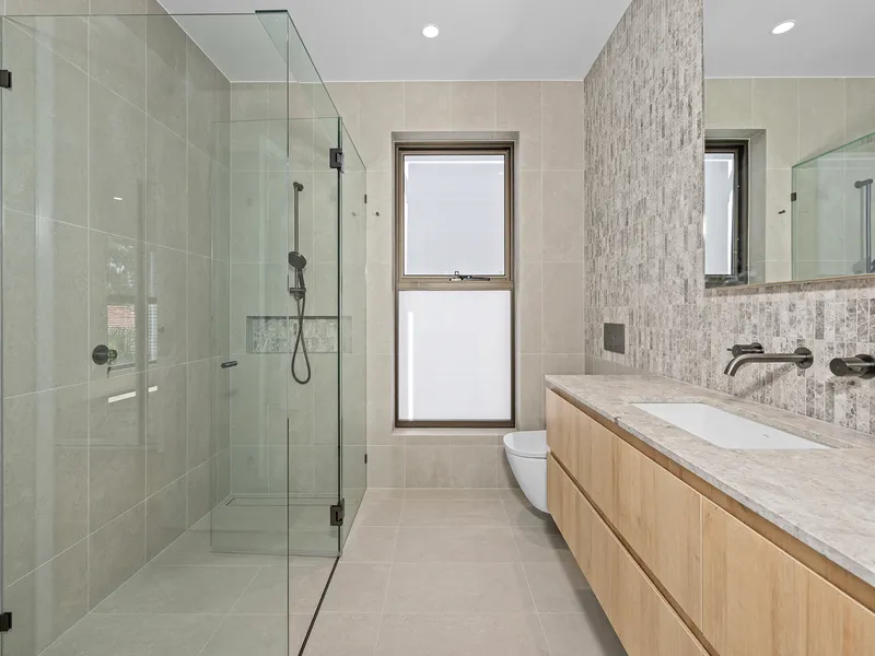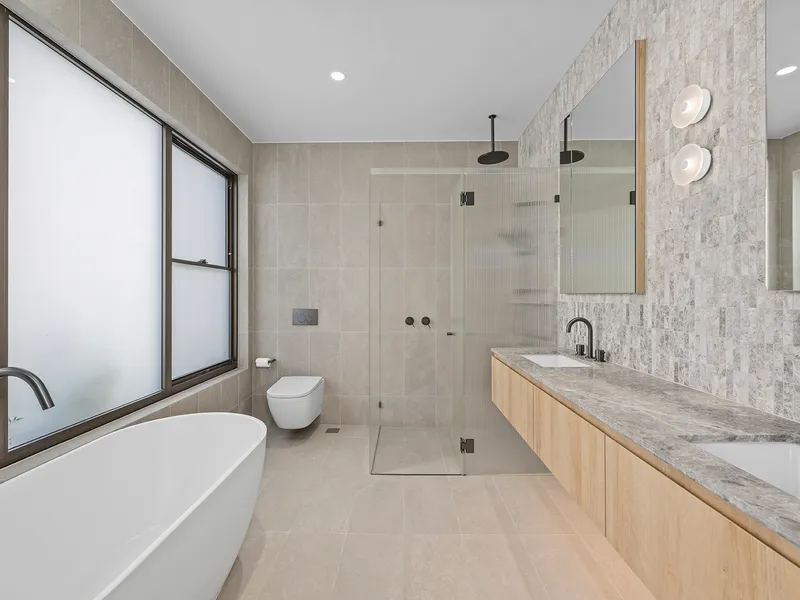 Upstairs, a second living or media lounge offers extra space to unwind or work from home. Each of the three generous bedrooms boasts a deluxe ensuite, ensuring comfort and privacy. The master suite is a true sanctuary, complete with a custom walk-in robe and a spa-inspired ensuite indulging you with an oversized shower, dual stone-topped vanities, and a freestanding designer bathtub.