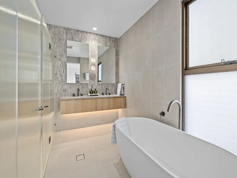 Upstairs, a versatile second lounge or media room and a convenient study nook provide flexible space for work or relaxation. Each of the three generous bedrooms boasts its own deluxe ensuite, ensuring ultimate comfort and privacy for all residents. The master retreat is a showpiece of luxury with a custom walk-in wardrobe and a resort-style ensuite featuring dual vanities, an oversized shower, and a freestanding bathtub. Completing this superb layout is a secure double garage with internal access and extra storage, adding everyday convenience to the list of luxuries.