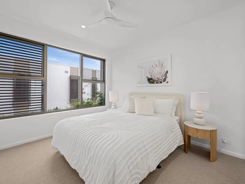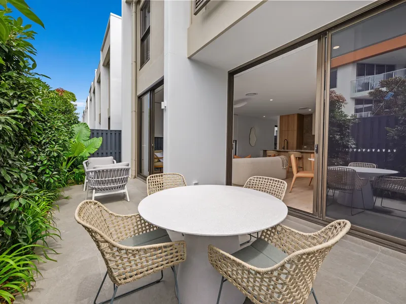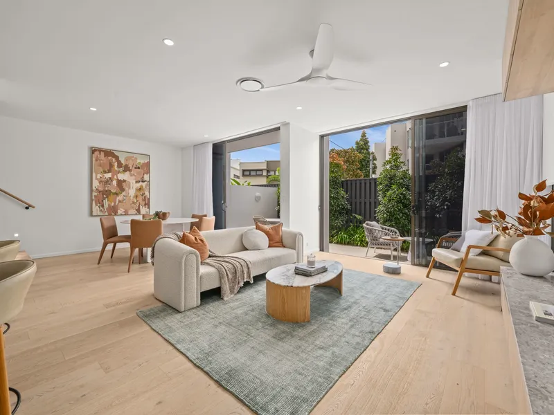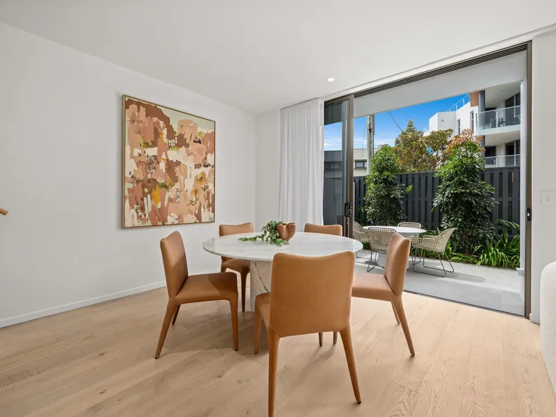 Step inside to discover a light-filled, two-level sanctuary of contemporary elegance. Expansive open-plan living and dining areas feature high ceilings, engineered timber floors, and custom cabinetry, all oriented to maximize natural light and garden views. The gourmet kitchen anchors the home with luxurious stone benchtops and high-end Gaggenau appliances, including an integrated refrigerator, and generous pantry, a chef's delight and entertainer's dream. Glass sliders connect the indoors to a private landscaped courtyard and tiled alfresco terrace, seamlessly uniting interior sophistication with outdoor serenity.